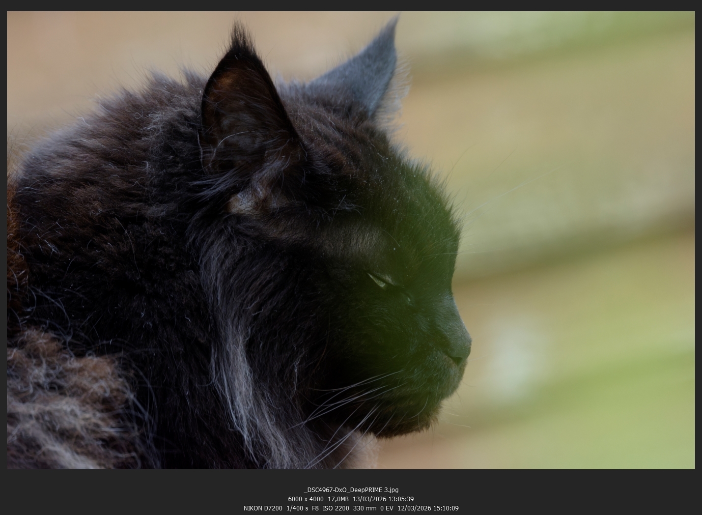 Le choix n'est pas simple j'en conviens. Si la différence de qualité est majeure entre f/5.6 et f/8 à 400 mm, perso par défaut je partirais à f/8. Mais tjs avec la possibilité de modifier mon choix selon les circonstances dont la luminosité ambiante mais également, plus difficile à apprécier sur le terrain, les écarts de luminosité cad la difficulté à conserver des détails à la fois dans les htes et les basses lumières. Pas tjs utile, mais qui parfois permet de mieux traduire ce qu'on a vu. Et à 12 800 ISO même avec un D5 je reste convaincu qu'on peut qd même avoir intérêt à tenter de modifier certains réglages pour pourvoir baisser un peu les ISO.